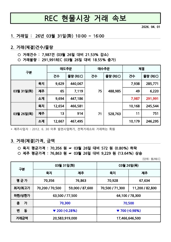 26년 03월 9차(03월 31일) 현물시장 속보 페이지 정보 작성자 관리자 작성일26-04-01 08:38 조회38회 댓글0건 관련링크 이전글 다음글 목록 본문 댓글목록 등록된 댓글이 없습니다. 이전글 다음글 목록